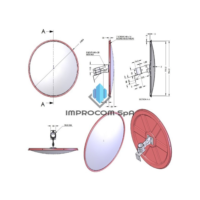 Espejo Convexo 80 cmEC80-INUso InteriorPara Instalar en MurosPeso 5.6 Kg.Incluye en su BaseAccesorios Metálicos para FijaciónIncluye Adaptador para Muros