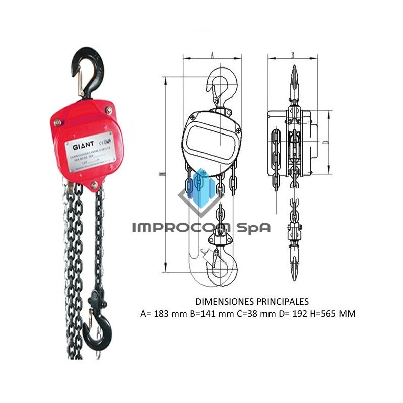 Tecle Cadena 3000 Kg x 3 mtModelo TCD-3X3Procedencia ChinaCaracterísticas TécnicasCapacidad de Toneladas 3 ton.Levante Máximo 3.0 mt.Accionamiento cadena para levantar un metro 70 eslabones.Tensión en cadena de accionamiento a plena capacidad 36 N.Número de Ramales 2Diámetro de la cadena de carga 8 mm.Peso 26 kg.VentajasNuez de cadena y engranajes mecanizados para un funcionamiento suave y operación más eficiente. Limitador de sobrecarga para prevenir levantes mayores a la nominal. Altura de levante de 3 m como estándar, disponible alturas mayores. Cadena de carga de alta resistencia grado 80 galvanizada (cumple con EN 818, seguridad factor 4). Diseño compacto y reducido peso. Ideal para aplicaciones en mantención u construcción. Carcaza de engranajes y tapas de acero de construcción robusta. Gancho de aleación ISO, tratados térmicamente y equipados con seguro.Uso